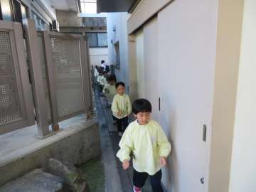 今回の出火場所は、職員室。正面玄関を通らずに避難しなくてはいけません。年長さんと2歳児は北玄関から、年中さんは給食室から園舎の裏を通って避難しました。