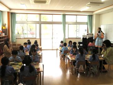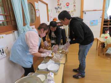給食の配膳や片付けなどは保護者の「お父さん先生」「お母さん先生」にもお手伝いいただき、皆で「いただきます」をしました。