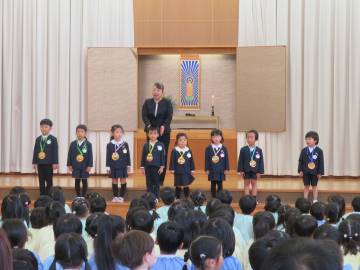 園長先生からお話をしていただいた後、誕生者がステージに並んで園長先生からペンダントをかけていただきました。