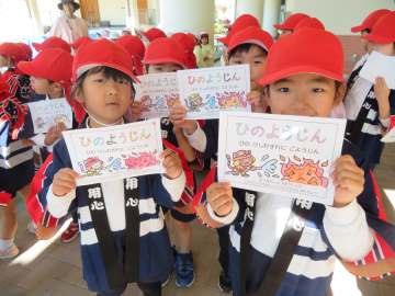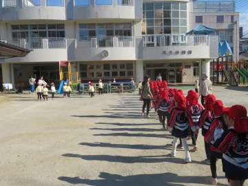 園に戻ると、年中さんが迎えてくれました。「年長さん、法被を着てかっこいいなあ」