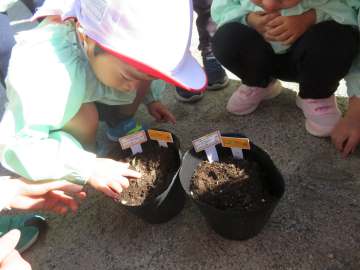 実は、昨年もどんぐりを植えたのですが、うまく育ちませんでした。今年は年少さんがどんぐりを植えてくれました。