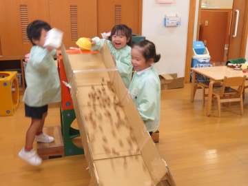 年少さんは園外保育で拾ってきたどんぐりを段ボールの坂道に転がして遊んでいました。どんぐりが転がる音を楽しんだり、どんぐりの大きさによって転がる速さが違うことにも気づき、転がしては拾ってまた転がすことを楽しんでました。