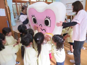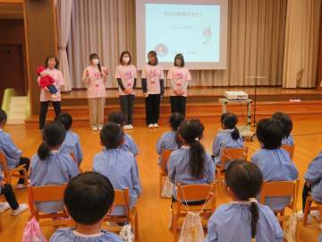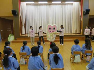飯田短大の安富先生とカミカミサークルの学生さんが来て下さり、年長児に歯科指導をして下さいました。