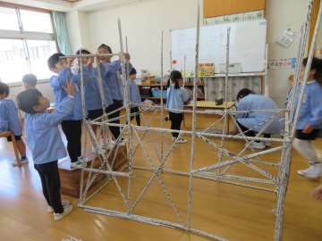 新聞紙を迷路の仕切りに使ったり、固く丸めてお家の柱にしたりと、友だちと一緒に作ったり遊んだりする年長さんです。