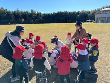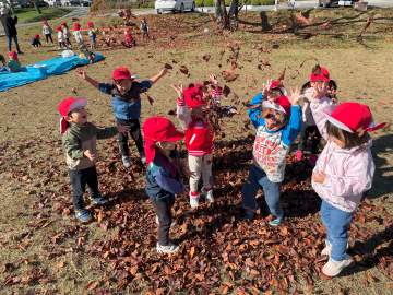 2歳の2クラスのお友だち皆で遊んだり、遠足の時にはまだ緑色だったどんぐりも落ちていて沢山拾ってくることができました。
