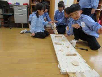 年長さんは 木の板に積み木やくぎを打ってビー玉を転がしています。