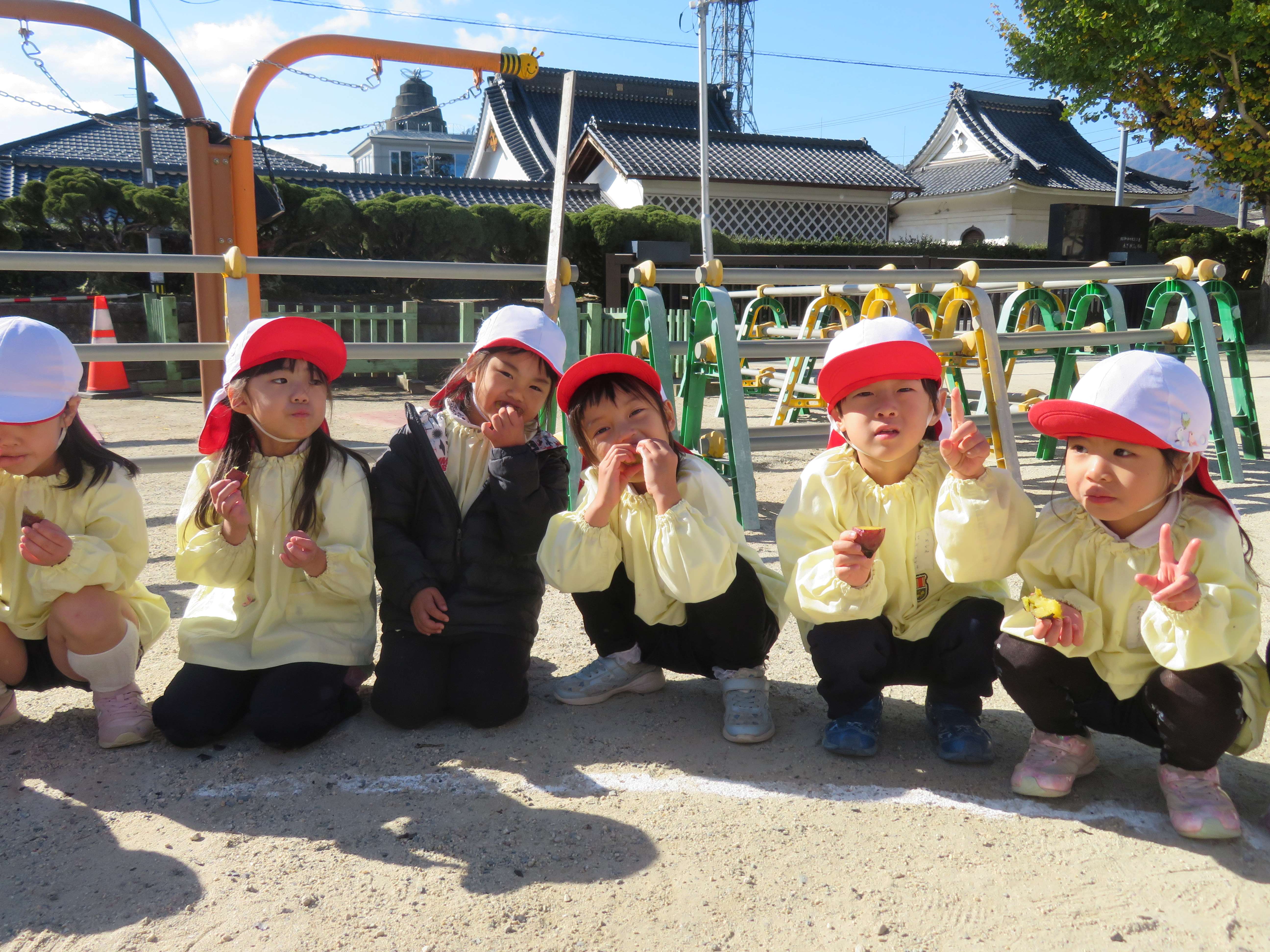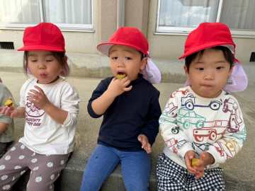 焼けたお芋を先生が皆に分けてくれました。黄色くてトロトロで甘いおいも、とってもおいしくいただきました。