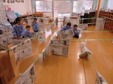 年長さん、どちらのクラスも新聞紙を使って遊んでいます。