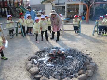 お芋を入れます。火は熱いな。準備をしたり、お芋を焼いてくれる用務員の先生、頑張ってね、ありがとうございます。