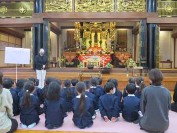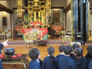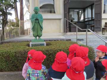 本堂のお飾りや親鸞様のお姿を描いた掛け物、園庭の松若丸様(親鸞様の幼少名)の像など、関心を持って見ました。