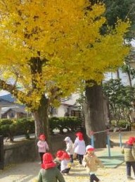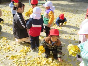 園庭のいちょうの葉っぱがハラハラと散っています。沢山の落ち葉に大喜びのこども達。