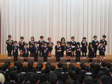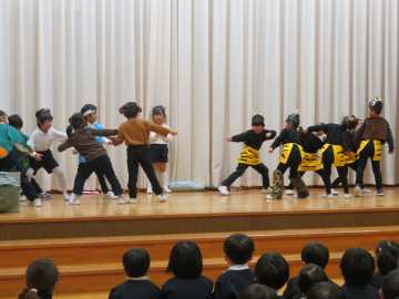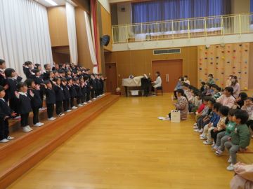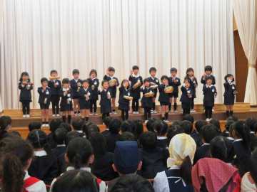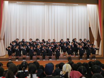 年少さんは学年合同で手遊び歌を見せてくれました。初めてのステージ、緊張しながらも楽しそうに歌っていました。