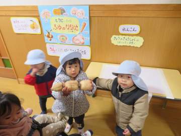 来年の干支は、「へび」です。年長さんが育てたさつま芋の小さくて食べられなさそうな物を使って芋版を作ります。
