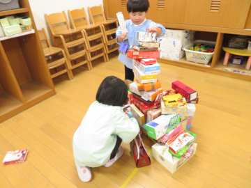 年少さんはお家から持ってきて頂いた空き箱で遊んでいます。