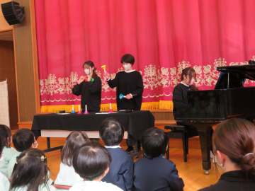 アトラクションは、ハンドベルとピアノの演奏会。先生方の演奏に合わせて皆で「勇気100%」も歌いました。