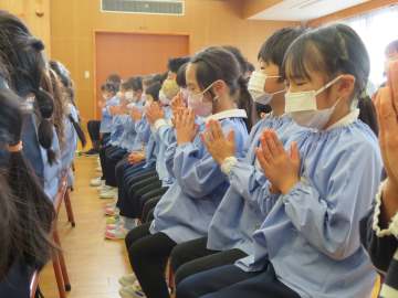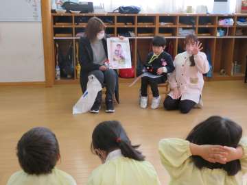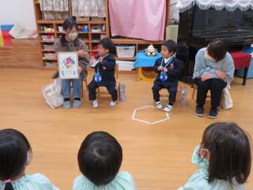 3歳以上のお友だちは遊戯室で集会です。インフルエンザが地域で流行っているのでマスクをして参加しました。