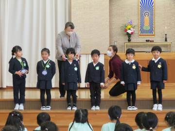 今月は2歳児3名、1歳児2名のお友だちが誕生日を迎えました。ペンダントをかけてもらい、皆で誕生日の歌をうたってお祝いしました。