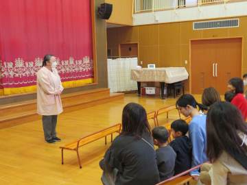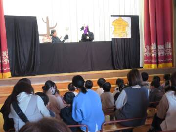 今回は、PTA人形劇クラブのお母さん方による「3まいのおふだ」の人形劇を観せていただきました。