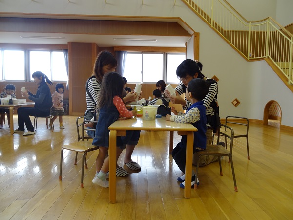 10月20・21日の両日、第10回のさくらんぼ親子登園がありました。今回の活動は、「身近なものを使って楽器を作ろう」ということで、親子で製作をしました。紙コップでつくるマラカスとビンの栓を使ったカスタネットを作り、後から合奏をしました。