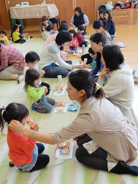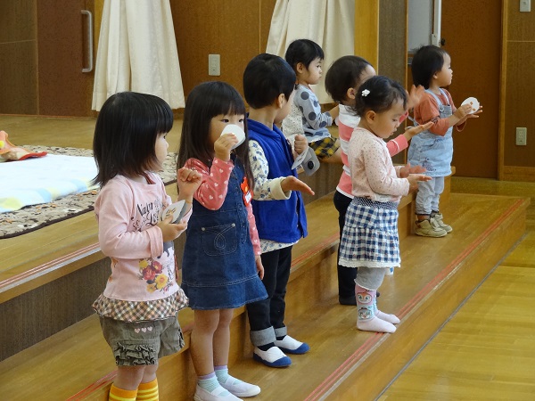 マラカスの中身は園にたくさん落ちているドングリ。一生懸命作った後は、みんなでおやつ。