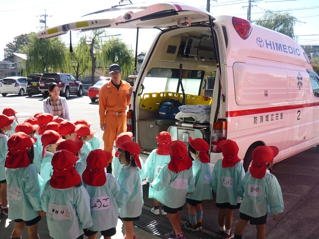 消防自動車や救急車を見て、説明をお聴きしました。「かっこいいー!」子どもたちの目は釘づけ。