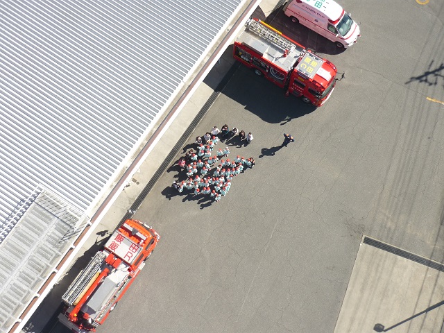 はしご車はこんなに高いんだよ。はしご車の上から、消防士さんが写真を撮ってくれました。高いビルから人を助けます。