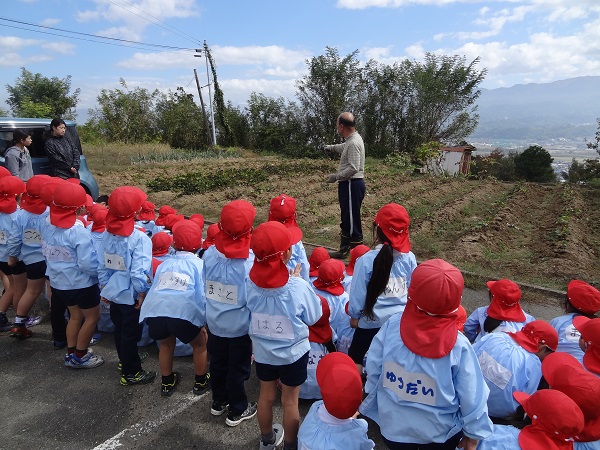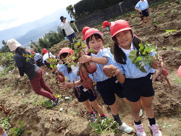 10月27日(火)、年長さんが育ててきた芋畑の芋ほり遠足に出掛けました。上郷にある芋畑までの道のりも、今ではすっかり慣れ「なんだか近くなったみたいに感じた。」という子どももいました。