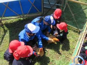 お出かけ日和に恵まれ、下伊那農業高校の農場見学に行かせていただきました。この見学は、コロナ禍で一時中止にはなりましたが、昭和41年(1966)頃から毎年受け入れていただいておりますので、60年近く続いています。毎年、下岡先生を中心に快く受け入れてくださり、生徒さんが授業の一環で、こどもたちに動物との接し方など分かりやすく教えてくれます。