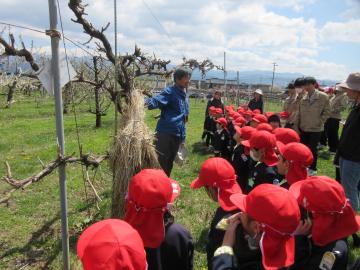 動物との触れあいの後には、果樹園をみせていただきました。下岡先生がくだもの当てクイズをしながら楽しくみせていただきました。たくさんの種類のくだものを栽培されているそうです。