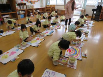 絵の具の扱い方を教えてもらった年長さん。じぶんで色を作って描いてみました。色の混ざり具合や水の量で変わることに不思議さや楽しさを感じるこどもたちでした。