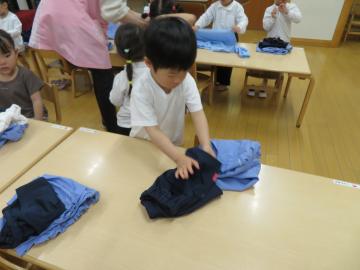 身体測定を行います。衣服の上手な脱ぎ方を教えてもらい、たたんで机の上に置きました。計器に乗って測定を受けることも上手にできていました。