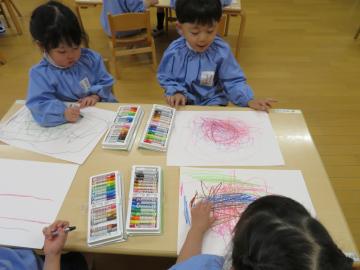 初めてのクレヨン。線を描いたりグルグルと大きく手を動かして描いたりを楽しみました。