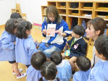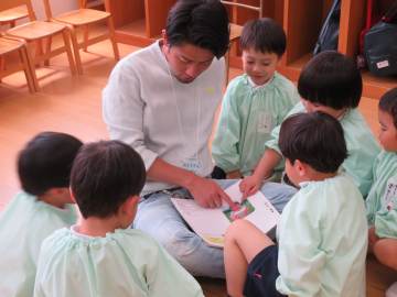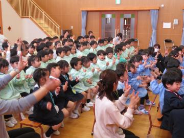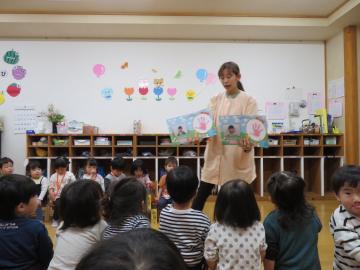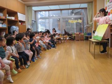 今月のアトラクションは、大型絵本でした。皆でたまごをコンコンコンとたたいています。