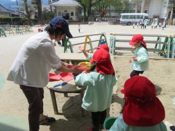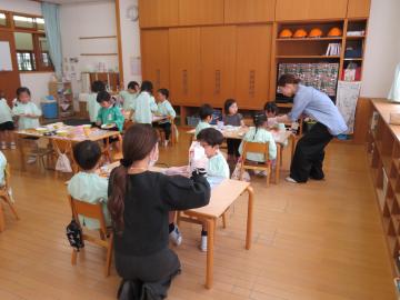 誕生者の保護者の方には、「おとうさん先生」「おかあさん先生」として誕生会に来園いただき、集会に参加し給食後の遊びまでご参加・お手伝いいただきます。