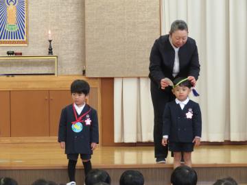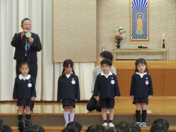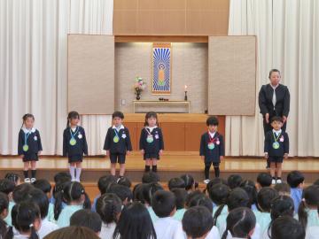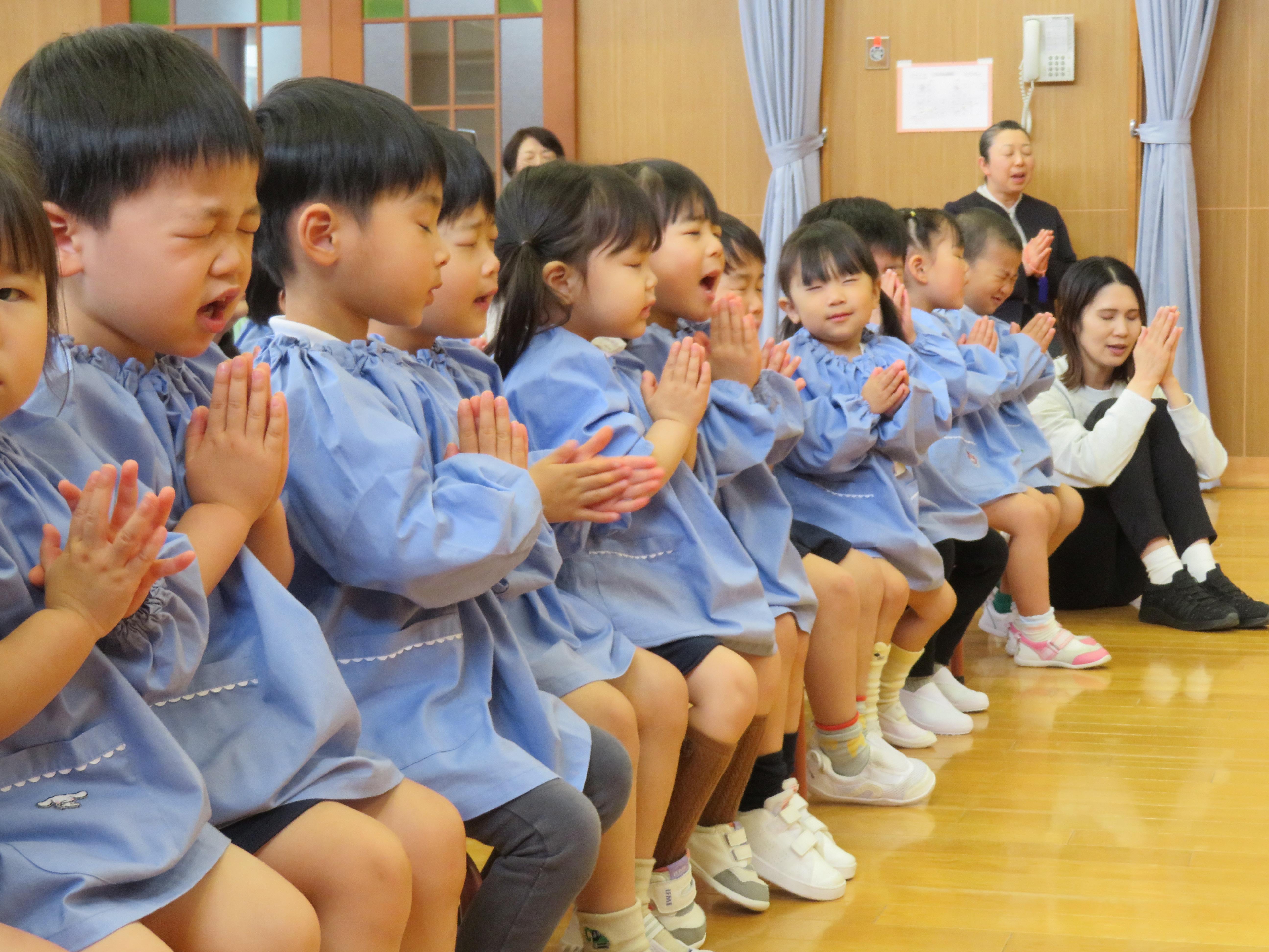 年少さんが遊戯室で集会をするのは初めてです。園長先生とのお参り、落ち着いてできました。