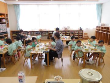 給食の時間です。保護者の方にも配膳のお手伝いいただき、皆で一緒にいただきます。