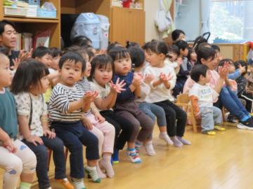 4月の誕生会は22日に行われました。3歳以上児は遊戯室で、未満児はたんぽぽの保育室で行います。