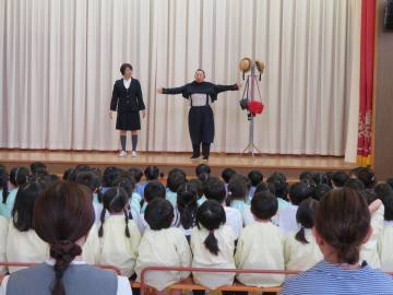 今月のアトラクションは、園長先生と川上先生が幼稚園に向かうお支度を面白おかしく演じてくれました。
