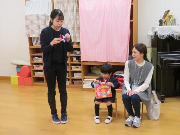 遊戯室での集会のあとは各クラスの時間です。誕生日バックの中に入っているものを先生から見せてもらっています。