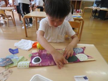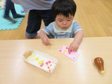 たんぽぽさんは、シールペタペタ。手にくっいたシールがうまく貼れないよ、不思議だな。先生に手伝ってもらいながら貼りました。