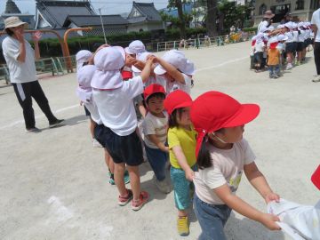 年少さんと2歳のお友だちは年長さんが作ってくれたトンネルを電車になってくぐりました。