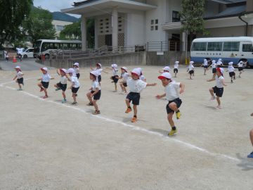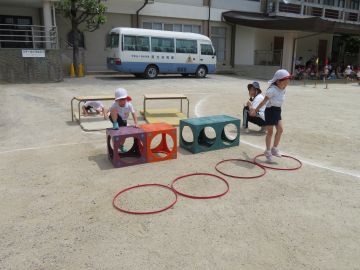 年長さんは、回ったりくぐったりジャンプしたりと、体を器用に動かして競走します。競う楽しさ悔しさも感じているこども達です。