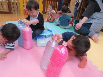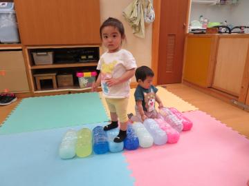 色水を入れたペットボトルが沢山。振ったり立てたり、並べて上を歩くこともできるんだよ。