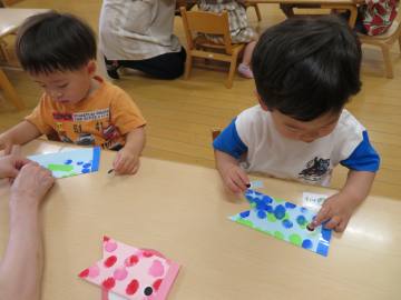 どこが目になるのかな?こいのぼりをみながら2歳のお友だちは目を貼りました。