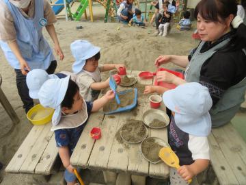 先生やお友だちと砂遊び。先生が作ってくれた車、前に進むんだよ。