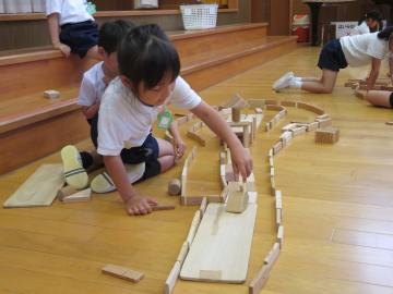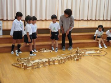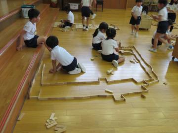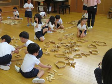 積み木を様々に組み合わせて作った物は、みんなそれぞれに工夫があり違うものでした。