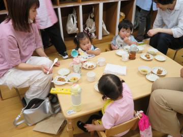 離乳の段階に合わせて刻みを多くしたり柔らかくしたりした給食も見ていただき、保護者の方もこども達と一緒に少し給食をいただきました。