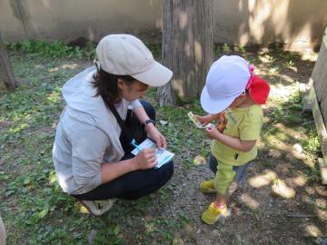 探検カードにあるものを見つけてシールを貼っています。木の実やアリを探していました。