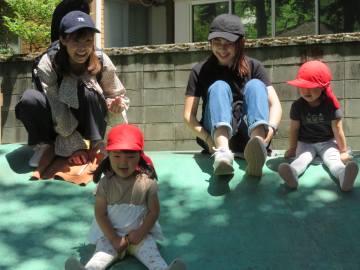 お父さんお母さんと一緒にすべり台をすべります。お山のすべり台は、夏は木陰で涼しく秋には沢山の落ち葉でも遊べる、こども達のお気に入りの遊び場です。