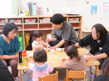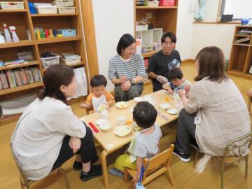 未満児の保護者の方には、クラス毎懇談をしてから保育に参加していただき、一緒に遊んだり給食を食べていただきました。。